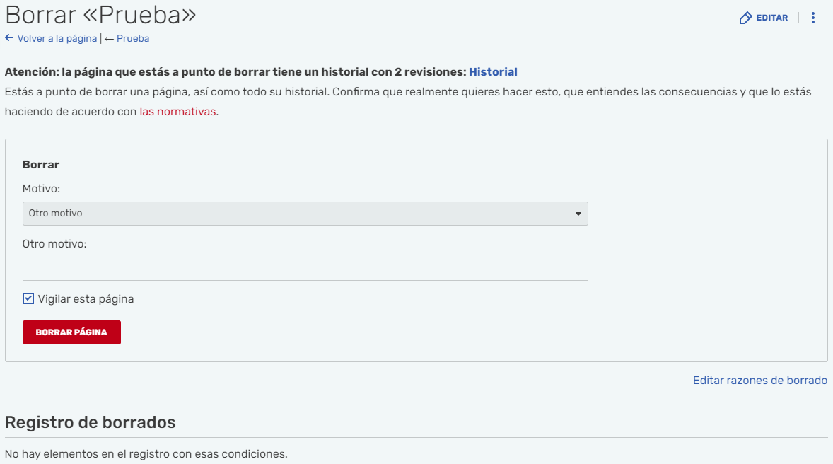 - Verás una página con un menú de "razones" predefinidas para borrar, una caja para razones adicionales y la opción de "vigilar esta página" si deseas saber si alguien la quiere volver a crear. Llena las razones por la cuales borrarás la página y dale clic a "borrar".