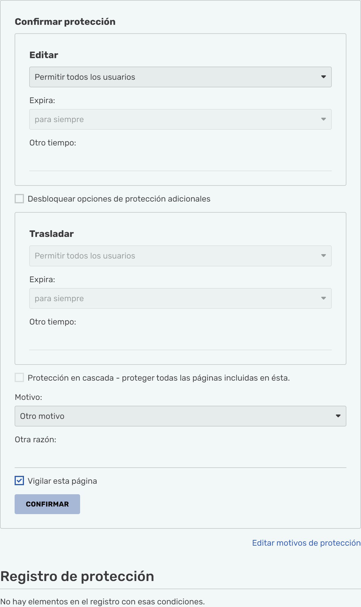 - También hay una opción para Protección en cascada, que protege completamente todas las plantillas, transclusiones e imágenes utilizadas en esa página. Es recomendable que esta casilla de verificación se deje sin marcar.