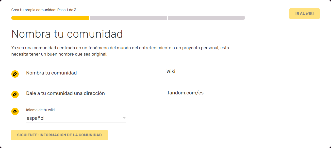 Cualquiera puede crear una comunidad (alojada en una wiki) en Fandom en cualquier momento a través del formulario para crear una comunidad. A continuación explicamos qué hacer y cómo hacer para crear una comunidad.