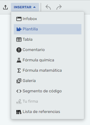 - En el editor visual, presiona la palabra en negritas Insertar que se halla en la barra de herramientas de edición y selecciona la opción "Plantilla" de la lista desplegable. También puedes escribir