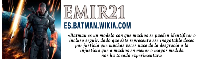 Me inicié en Wikia en febrero de 2011, pero fue en diciembre cuando conocí Batpedia, donde buscaba información sobre un juego. Desde ahí comencé a editar todo lo relacionado con el personaje. También conocí a Emir21, que hace un gran trabajo en dicha comunidad. En esta wikia me quedo la mayoría de las veces leyendo todos los artículos que se crean cada día, y donde les animo a los usuarios fanáticos a que se unan.